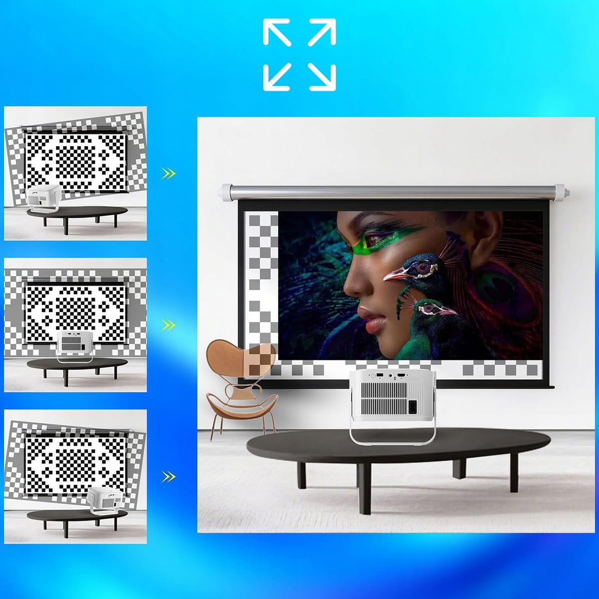 - ✅ Auto Keystone 4D – pokročilá korekce lichoběžníkového zkreslení - Zařízení automaticky srovnává obraz vertikálně i horizontálně a zajišťuje tak dokonale obdélníkovou projekci, i když projektor stojí pod úhlem.