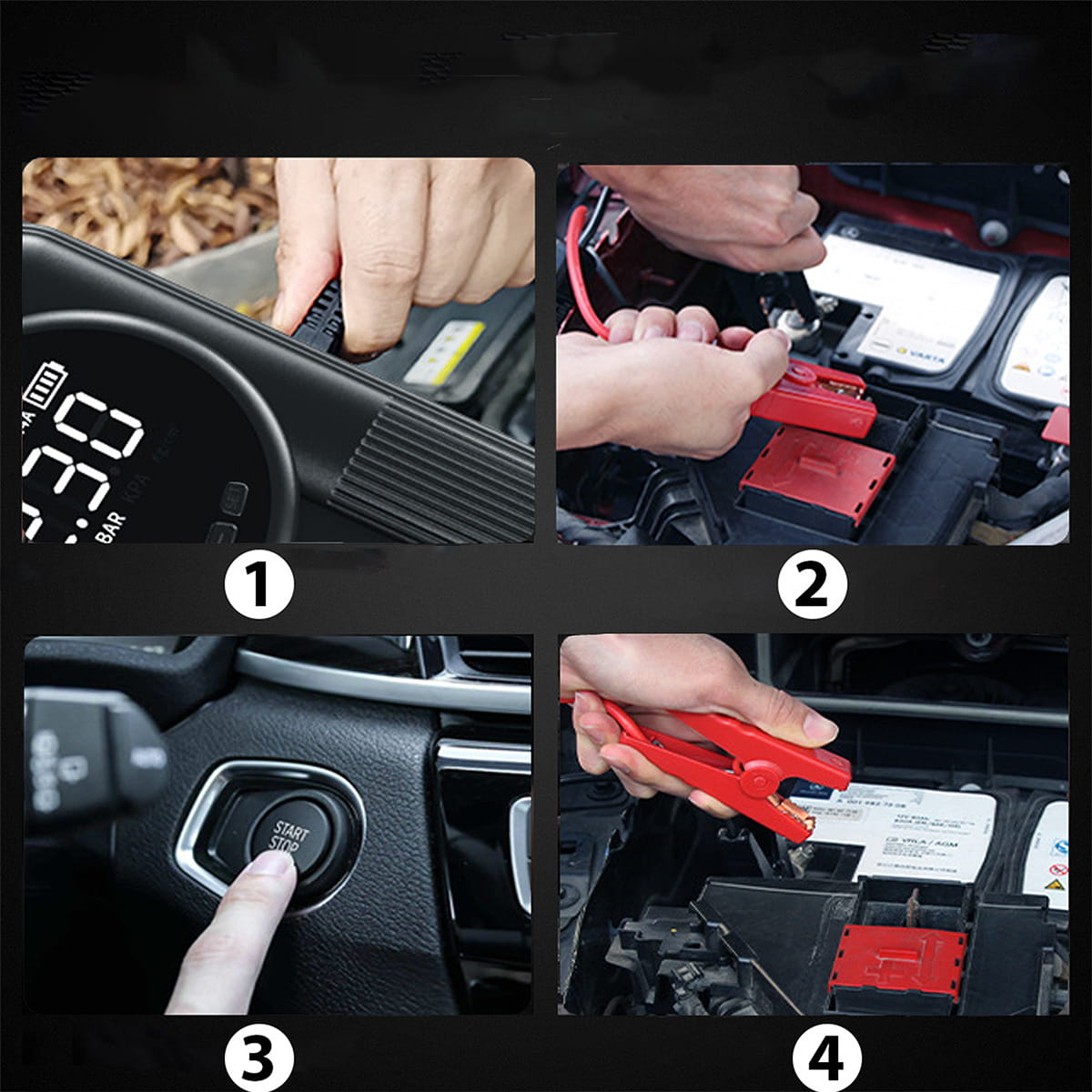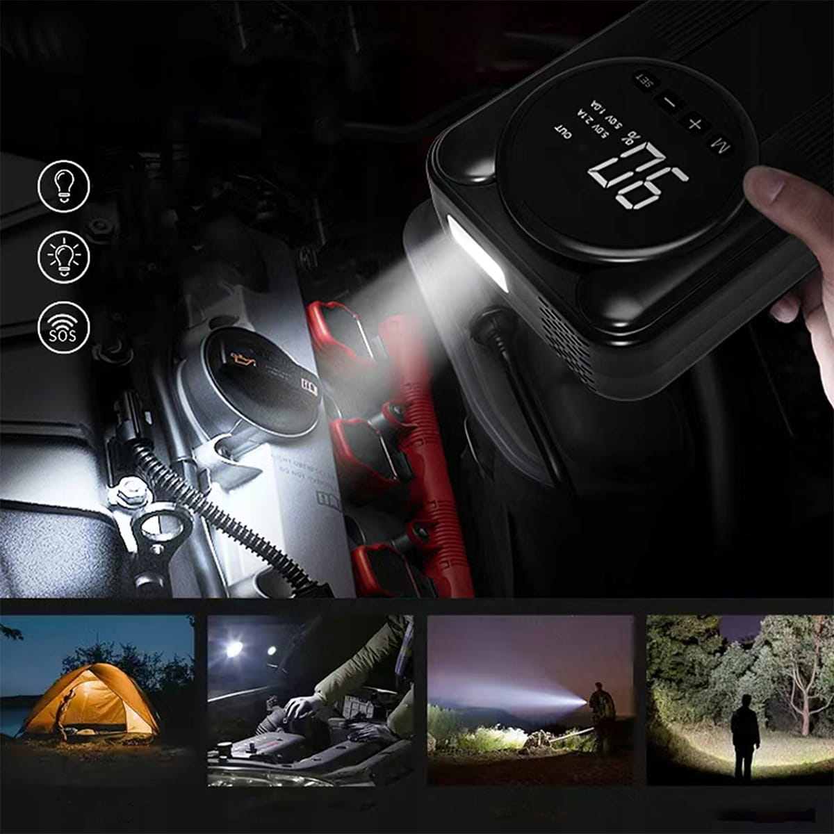 - Pokročilé zařízení 4v1 stvořené pro nouzové startování 12V motorů, huštění pneumatik, jako výkonná powerbanka a svítilna.