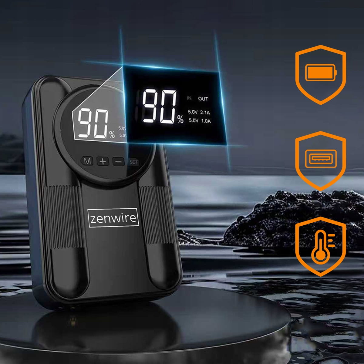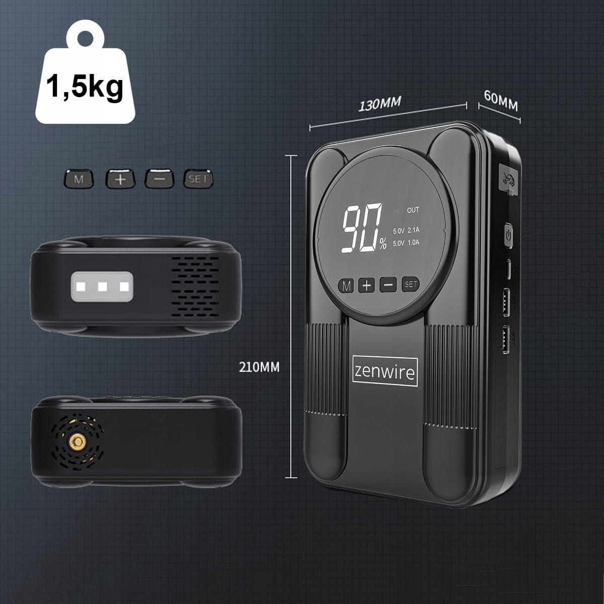 - Zenwire CYD14 má výkonný kompresor s maximálním tlakem 150 PSI, který umožňuje bleskové dofouknutí pneumatik automobilů, motocyklů, kol a různého příslušenství, jako jsou míče, vodní matrace a další.